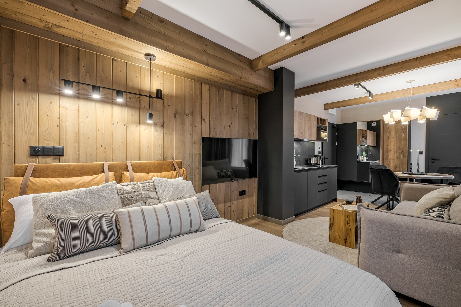 • Część wypoczynkowa: wygodna rozkładana sofa oraz dodatkowe miejsce do spania (łóżko w zabudowie 145x200),TV, komoda i nowoczesne oświetlenie