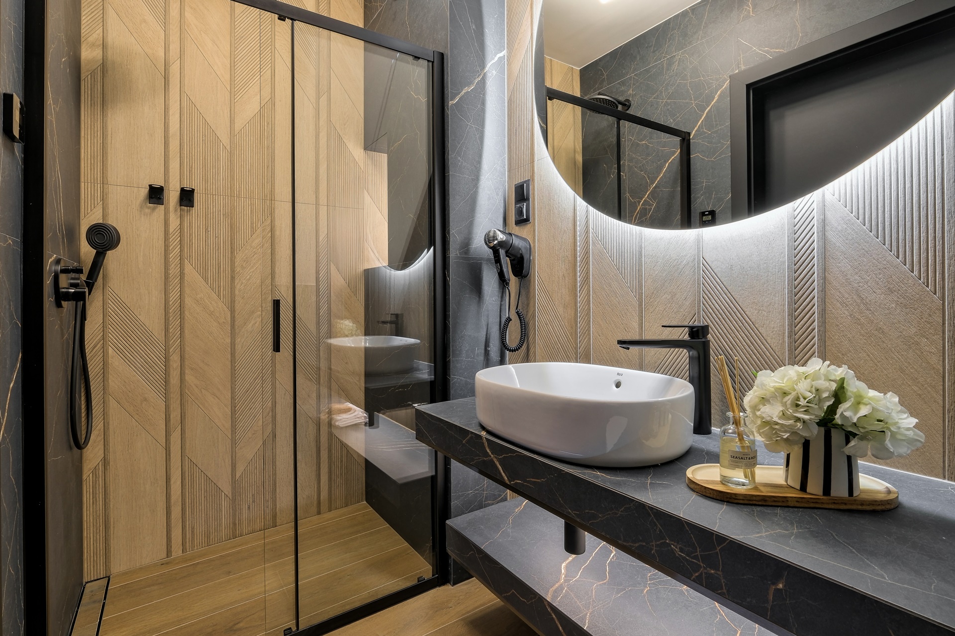 Łazienka w standardzie premium została wykończona kamieniem, podświetlanym lustrem oraz nowoczesną czarną armaturą.