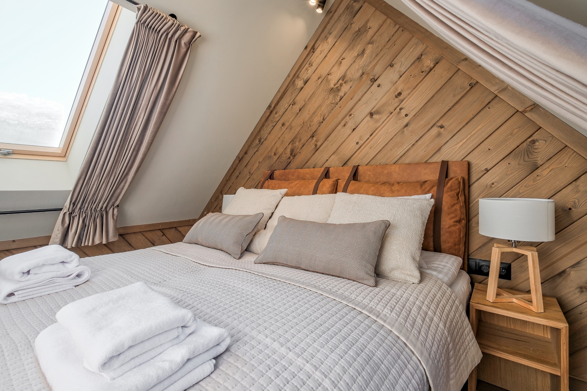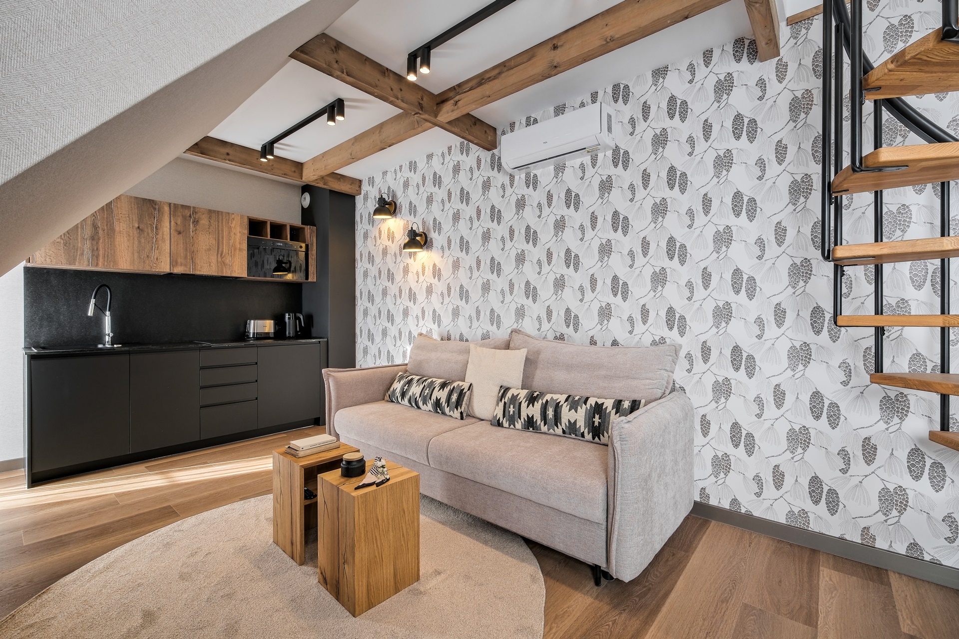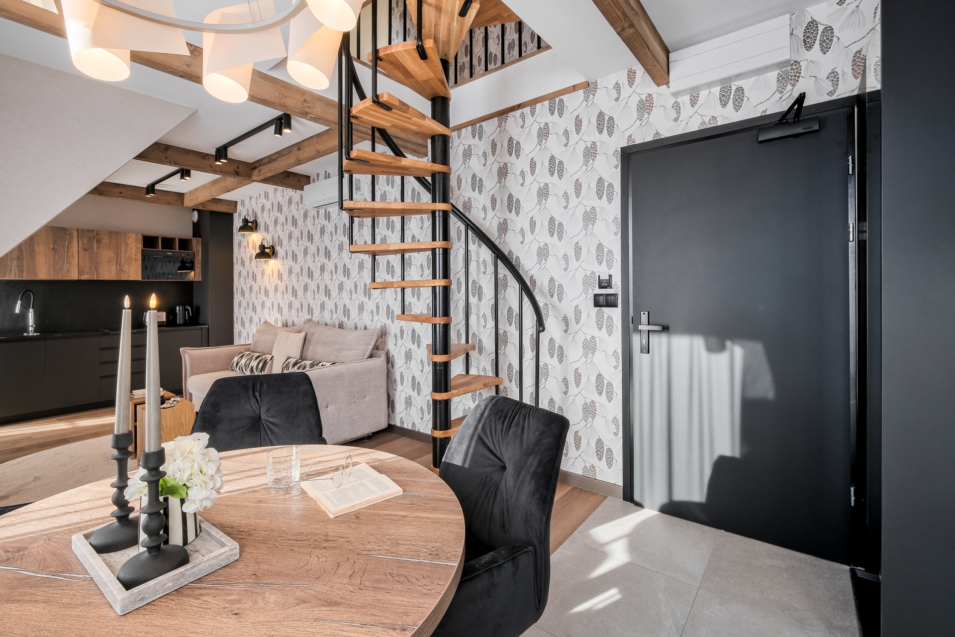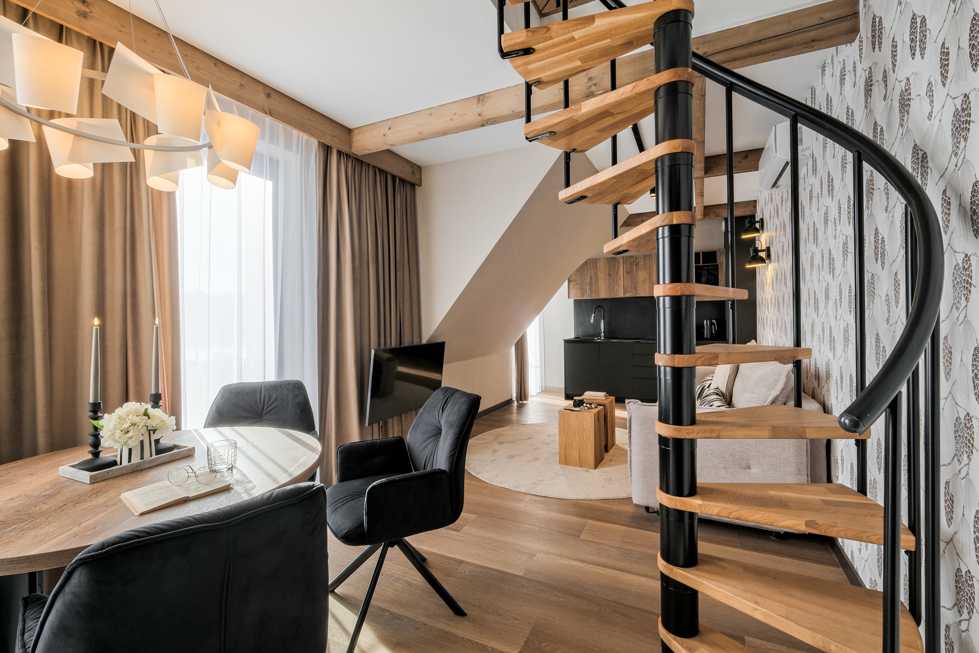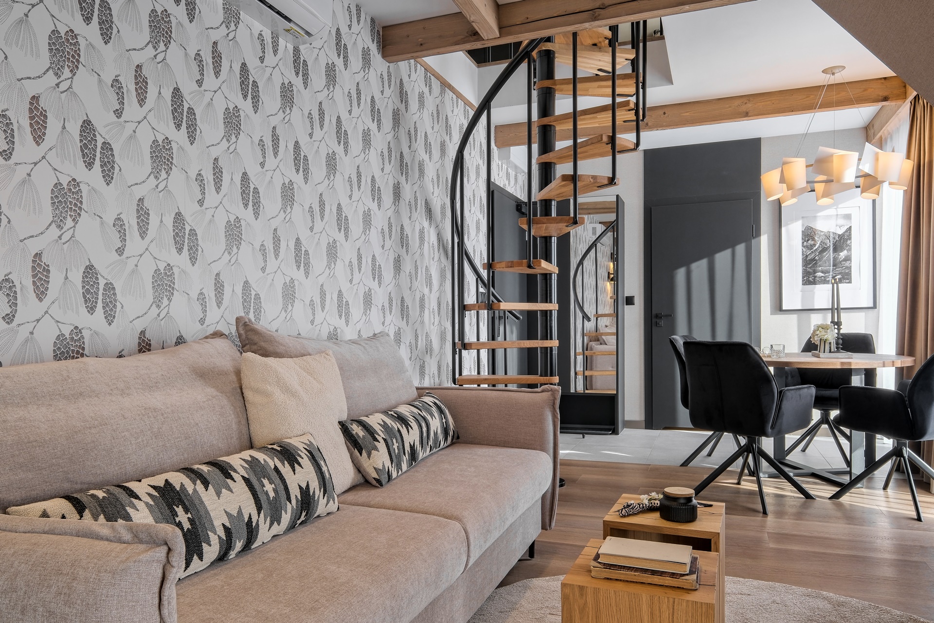Apartament zachwyca dopracowanymi detalami oraz stonowaną, naturalną kolorystyką. Drewniane akcenty, miękkie tkaniny i designerskie oświetlenie tworzą przytulny, górski klimat.